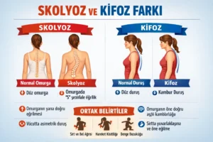 Kifoz ve skolyoz çoğu zaman birbirine karıştırılır. Ancak kifoz, omurganın öne doğru eğilmesiyle kambur bir görünüm oluştururken; skolyoz, omurganın sağa veya sola doğru eğilmesiyle S veya C şeklinde bir yapı ortaya çıkarır. Bu temel fark, hastalıkların hem teşhis hem de tedavi süreçlerini doğrudan etkiler.